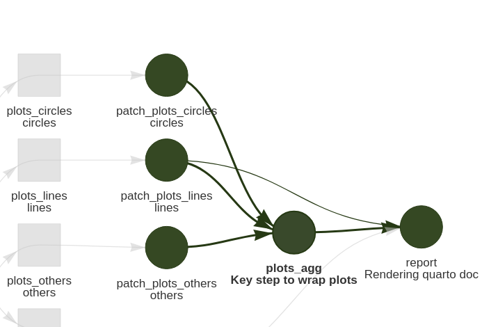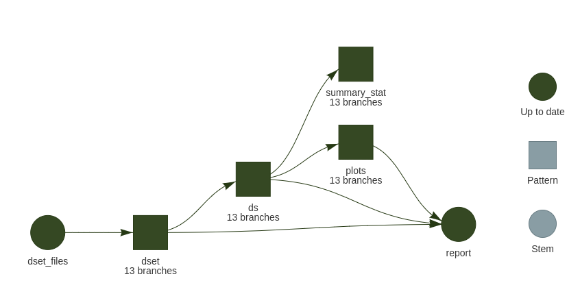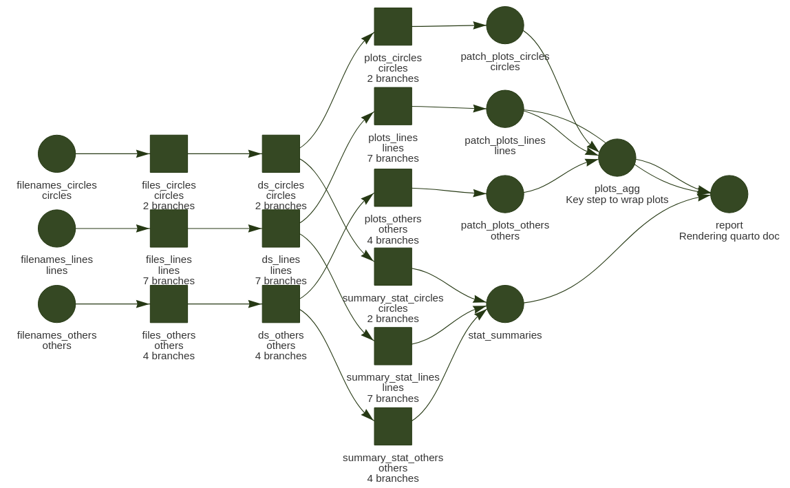 list(mapped, stat_combined, plot_combined, tar_quarto(report, "ds3.qmd", description = "Rendering quarto doc"))Dynamic branches still have cryptic names. What is we want to go full static where all steps are known upfront.